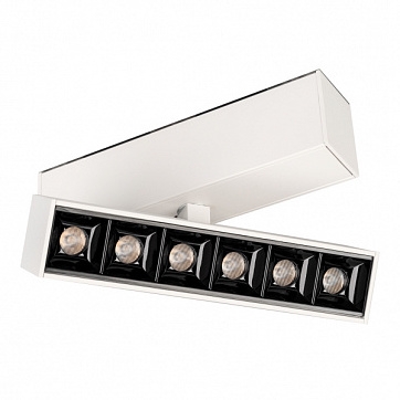 Светильник поворотный для магнитных треков шириной 45мм, 6Вт. Цвет свечения ДНЕВНОЙ 4000K, световой поток 455лм, угол 15°, CRI>90. Корпус прямоугольный, металл, цвет белый, IP20. Размеры LxWxH 163x35x92.5мм. Входное напряжение DC24V, мощность 6Вт.